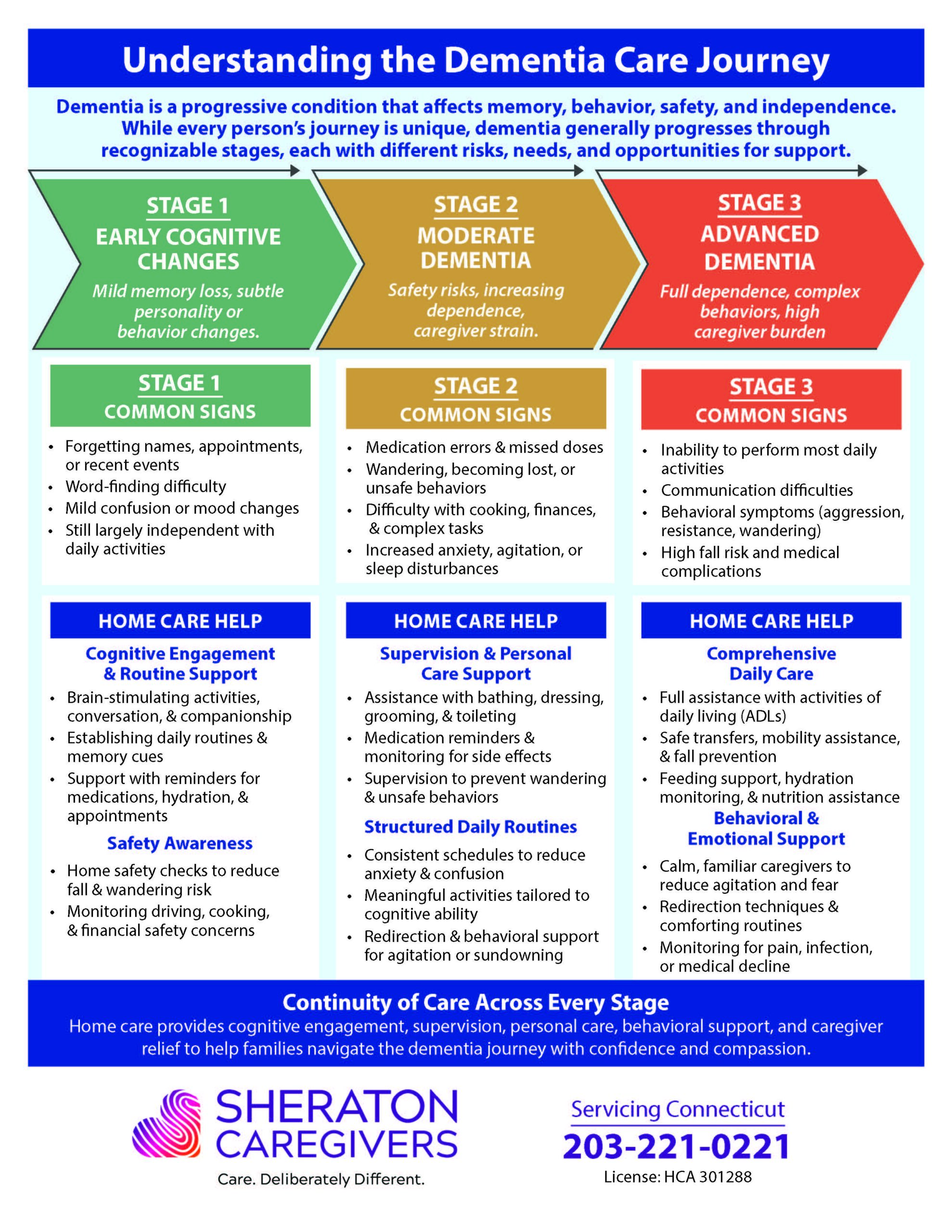Each stage of the dementia care journey Connecticut families navigate brings different challenges, from mild confusion to full daily care needs.